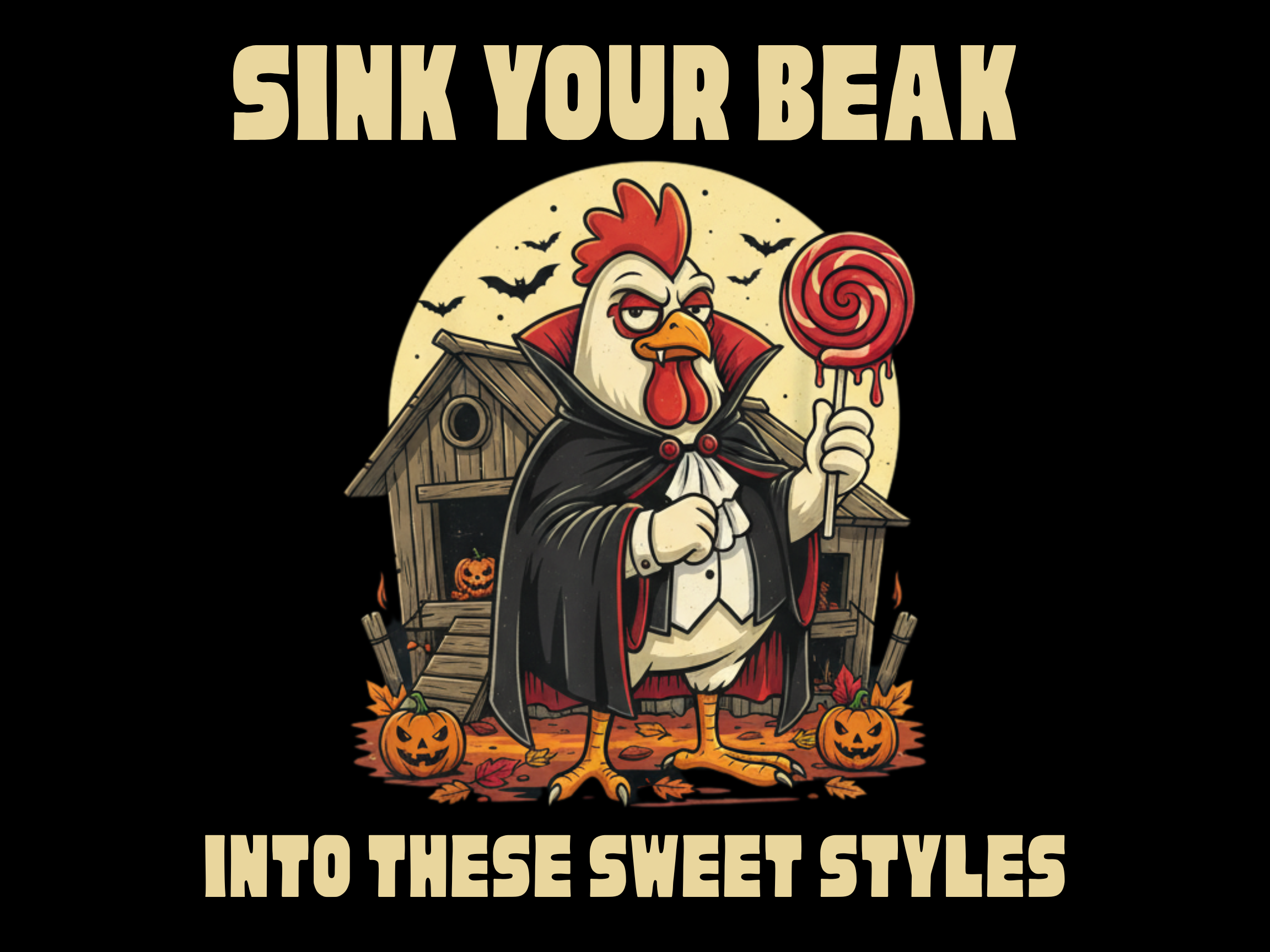 Introducing the SUCKER FOR A POP collection, starring the one and only Coop Daddy as the coolest (and maybe a little spookiest) rooster on the block. He's got his iconic lollipop, a sharp new vampire look, and a thirst for treats.