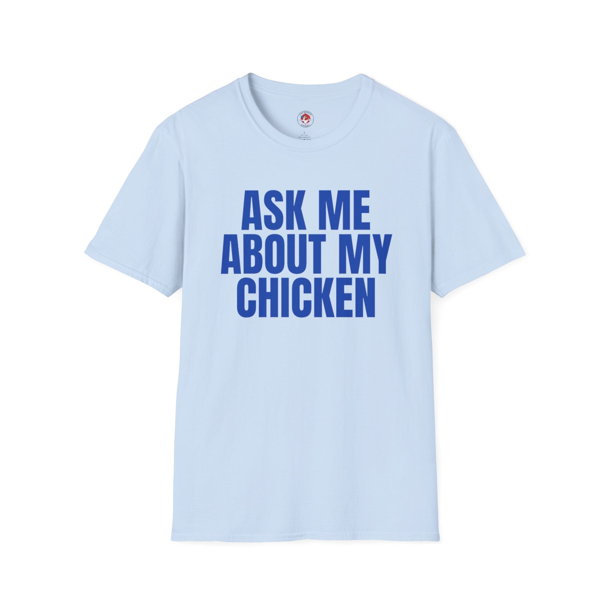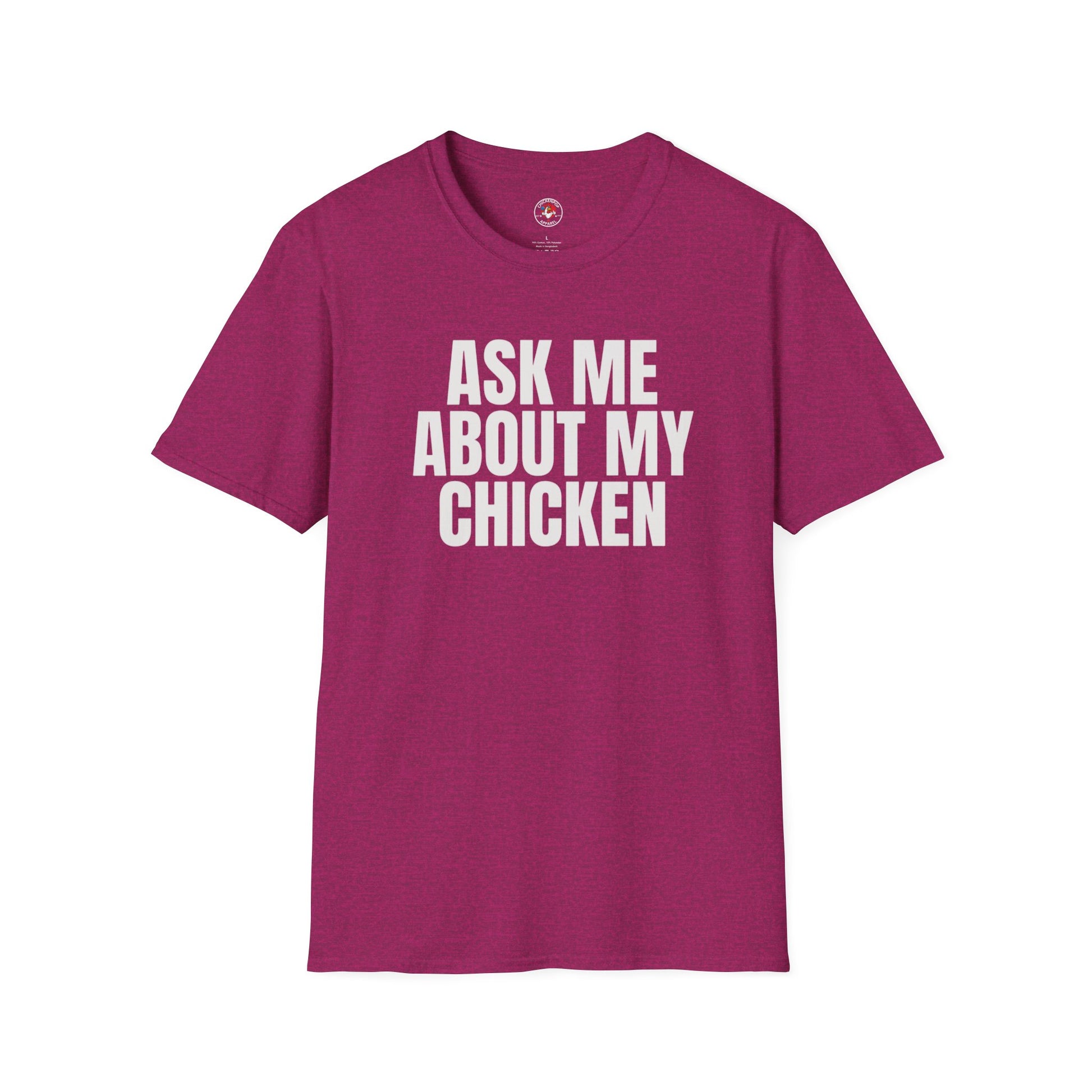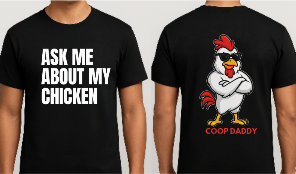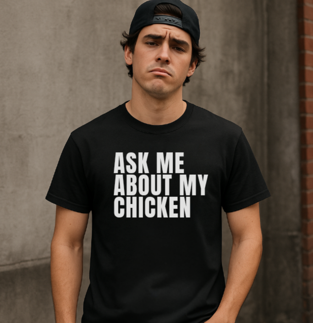 This bold unisex tee is your new conversation starter—starring sass, mystery, and a chicken with attitude. Featuring “Ask Me About My Chicken” in big, unapologetic font across the front, and Coop Daddy strutting his stuff on the back like the legend he is.