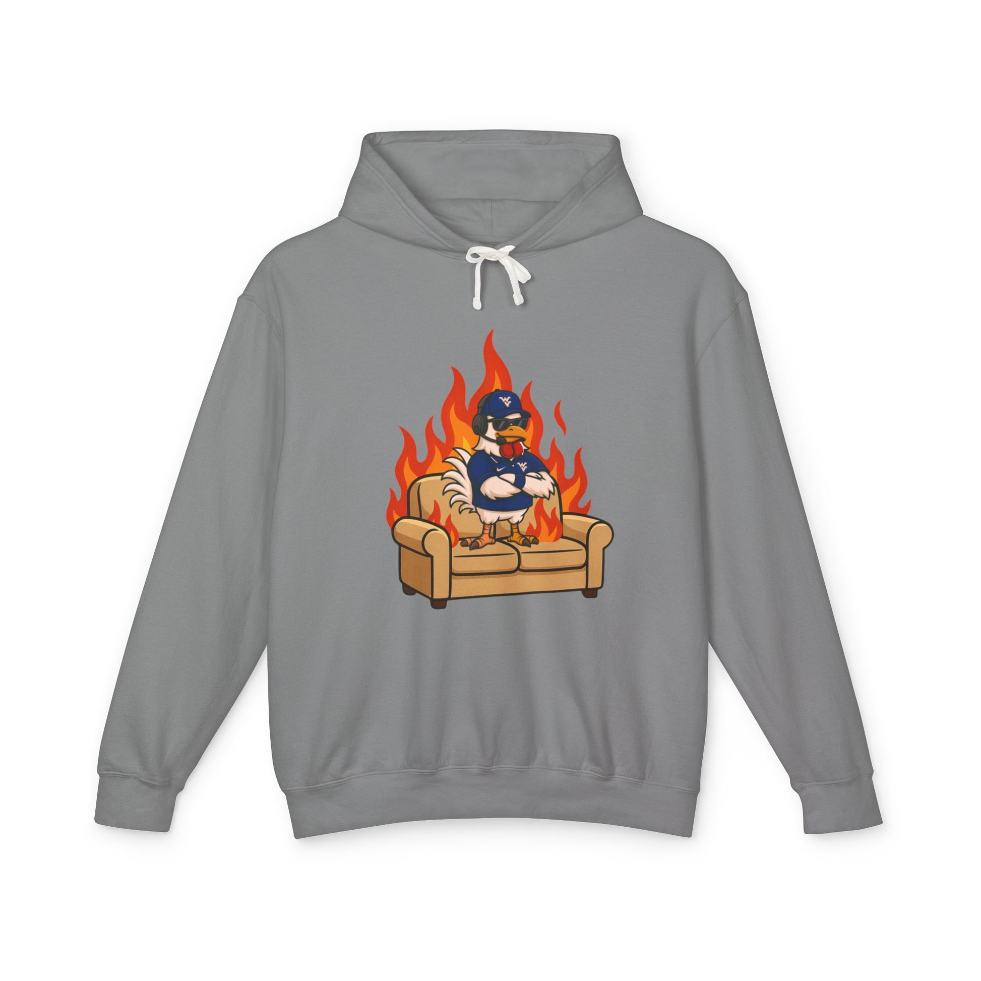 Turn up the heat with the Big Rich Energy Burning Couch Hoodie! This unisex cotton-blend hoodie features a bold burning couch graphic with “Big Rich” on the front, and the statement-making quote “When life hands you chaos… set the couch on fire 🔥” on the back. Designed with a soft, durable cotton-poly blend, adjustable hood, and front pouch pocket, it’s perfect for tailgates, streetwear, or anyone ready to embrace chaos with style. A must-have hoodie for WV fans and bold personalities who love standing out.