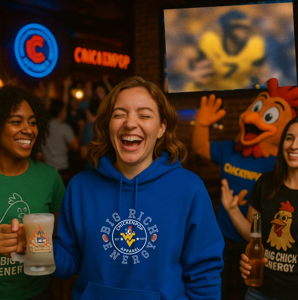 Celebrate the return of Coach Rich Rodriguez to WVU in style with our Big Rich Energy Hoodie! Featuring the striking Big Rich Energy Logo with the WV Mountaineers theme on the chest and the ChickenPop Apparel logo on the arm, this hoodie is a must-have for fans who bleed blue and gold. Subtle yet bold, it’s a perfect way to show your Mountaineer pride with a touch of flair.