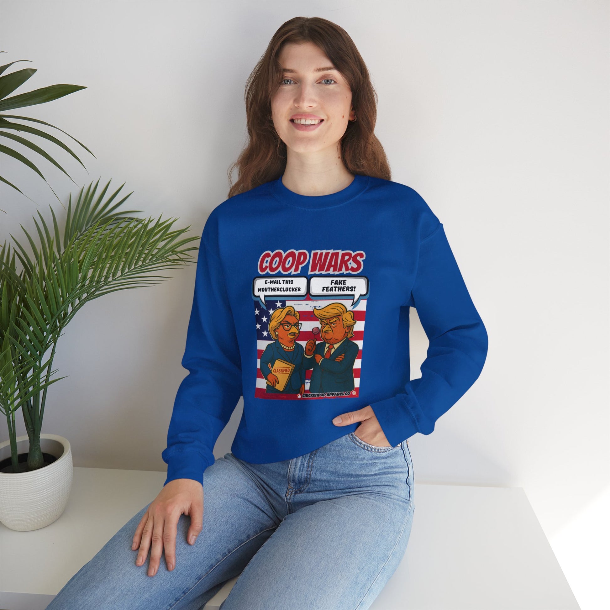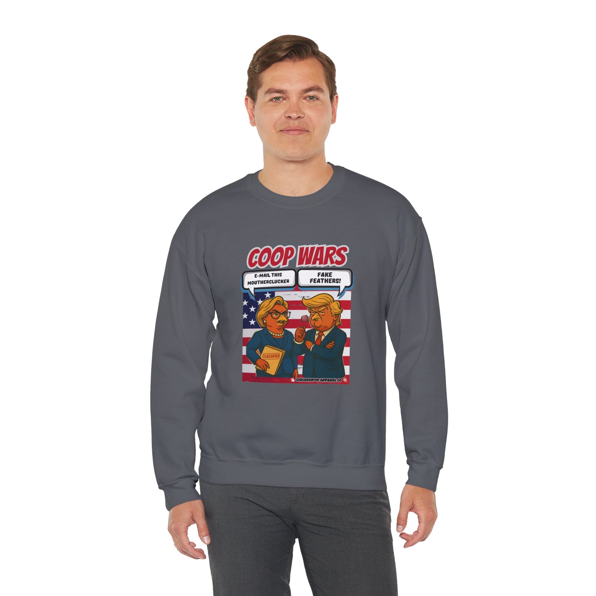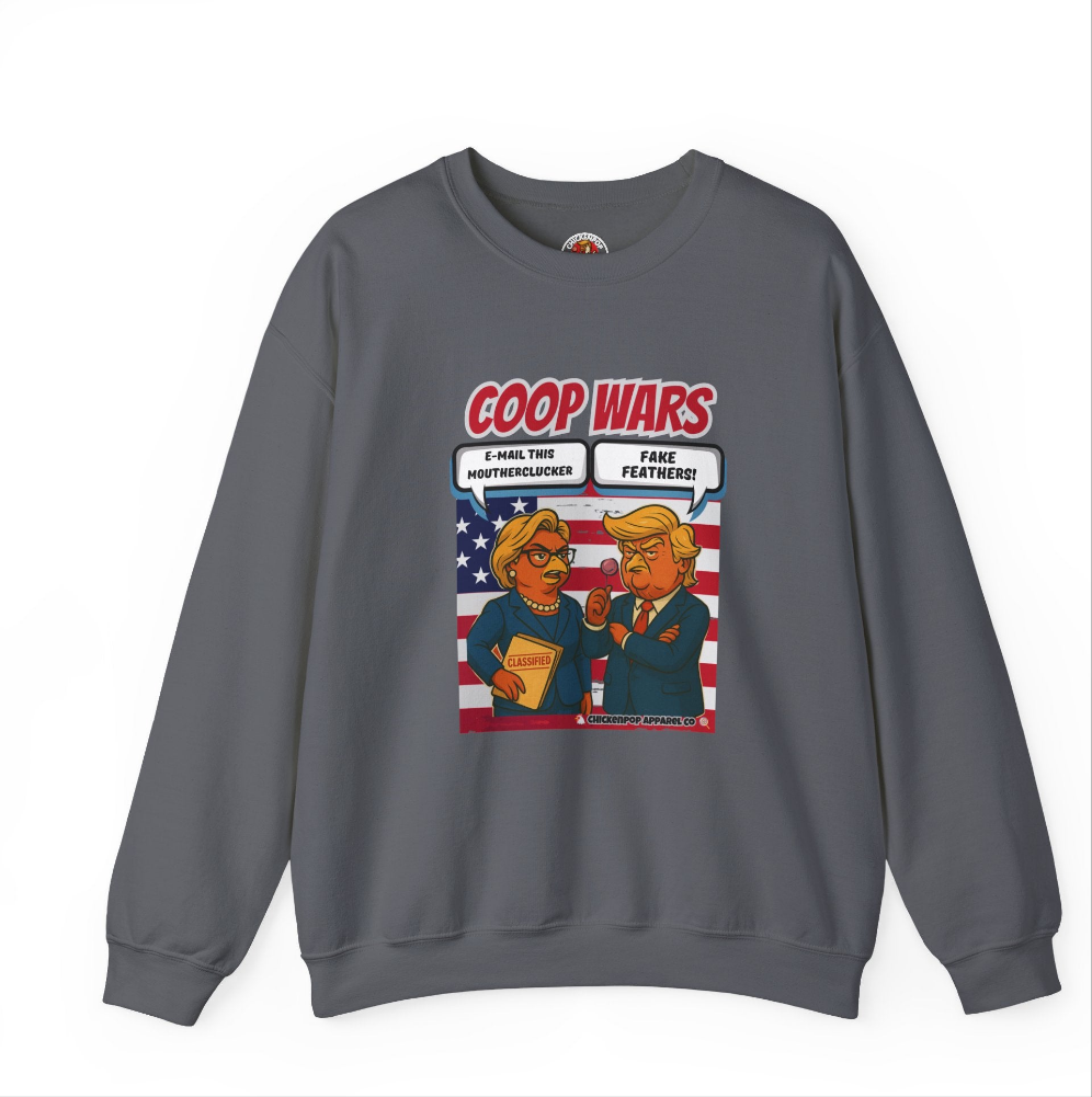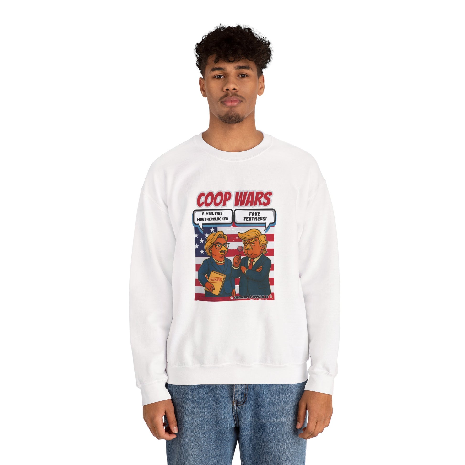 Coop Wars Crewneck Sweatshirt – Funny Political Graphic Pullover | Unisex Heavy Blend with ChickenPop Logo | Ethically Made & Cozy Cold-Weather Humor