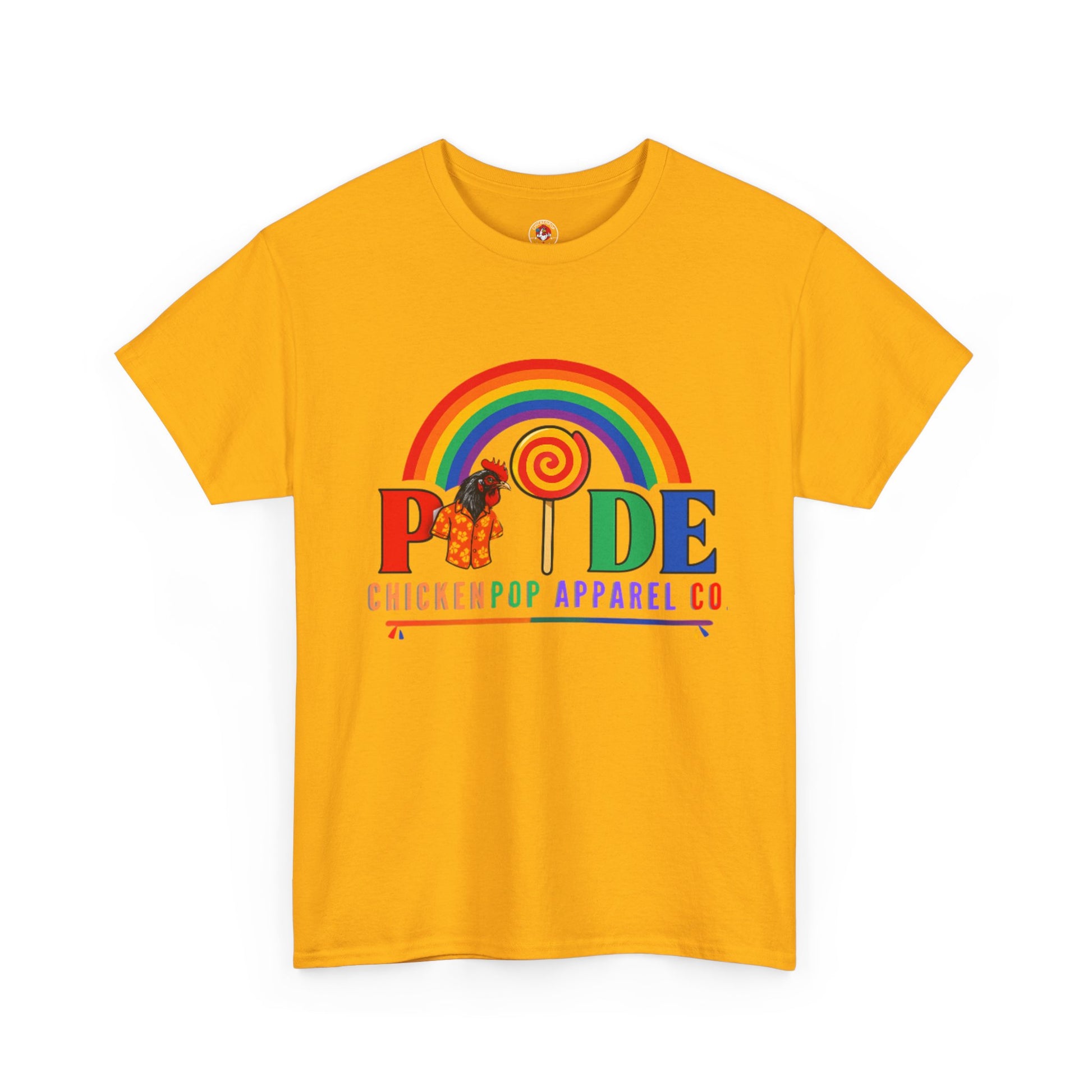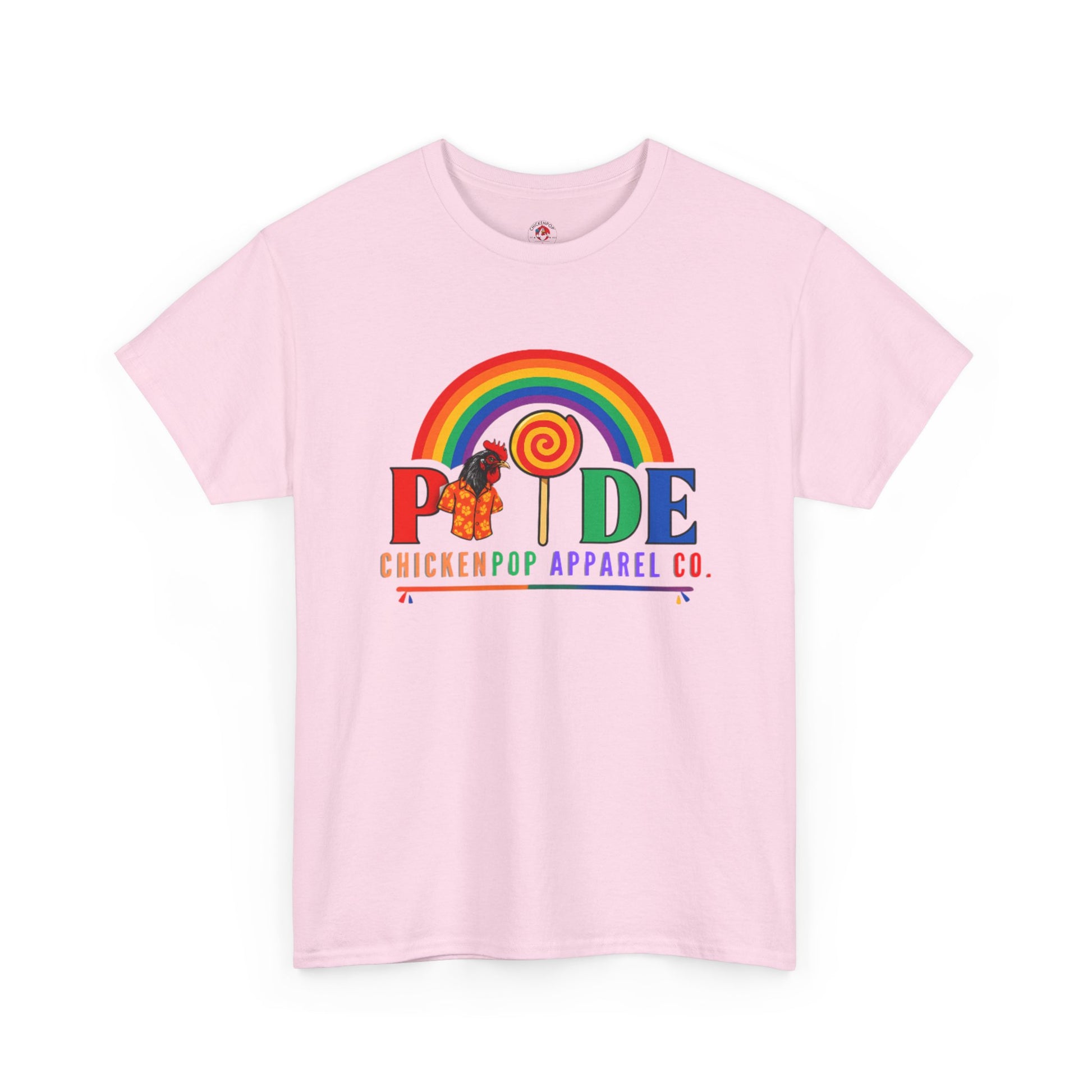 Show your colors loud and proud with the ChickenPop PRIDE T-Shirt! Featuring a vibrant rainbow, a sweet swirl lollipop O, and Coop Daddy rocking his iconic Hawaiian shirt, this tee brings big personality and even bigger Pride energy. Made for everyone in the LGBTQ+ community and allies who love fun, color, and unapologetic self-expression.